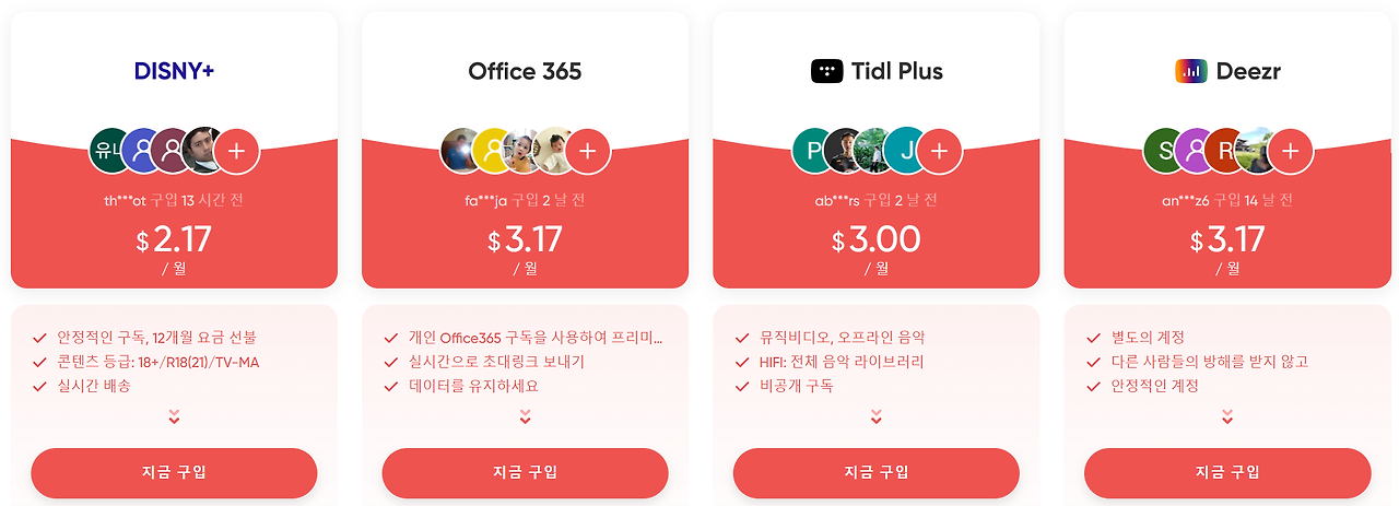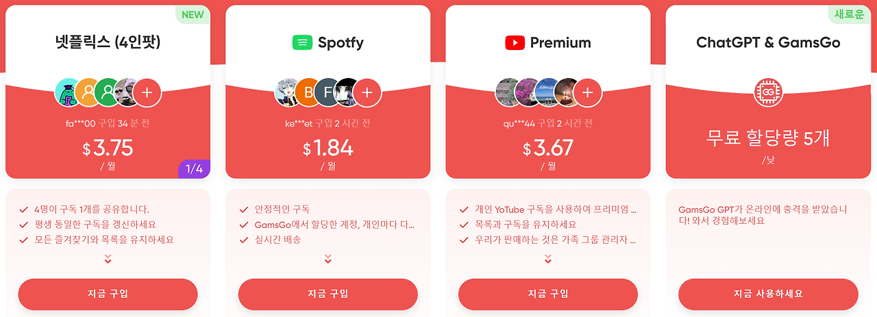 | 넷플릭스 프리미엄 | 4인팟 구독 / 구성원 랜덤 매칭 |