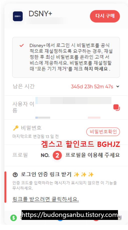 4) 결제가 완료되면 겜스고 홈페이지 상단의 구독 메뉴에서 디즈니플러스를 시청할 수 있는 계정을 공유받게 됩니다. 이 계정의 ID와 비밀번호로 디즈니플러스에 접속하셔서 자유롭게 시청하시면 됩니다.